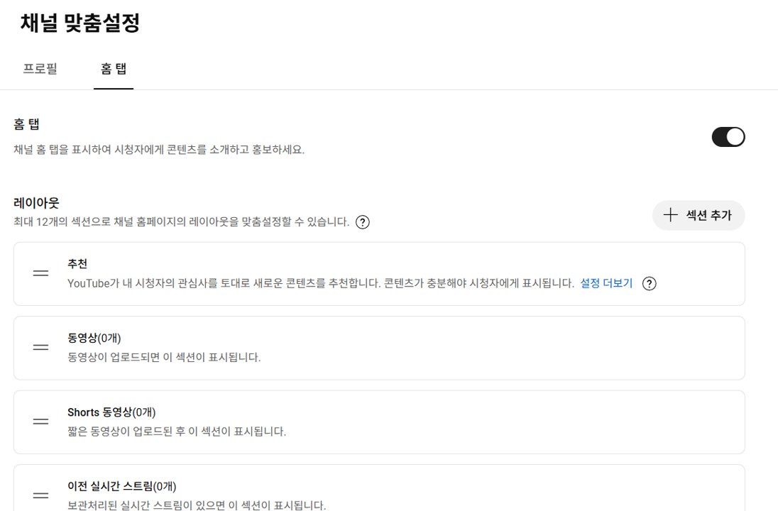 채널을 효과적으로 보여주기 위해 다음과 같이 설정해 보시는 것을 추천합니다.